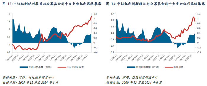 我们标准化每个季报期截面的A股股息率,形成股息率因子,然后合并每个季度偏股型公募基金(Wind二级分类属于普通股票型、偏股混合型、灵活配置型基金)的前十大重仓持股,对2009年Q4以来的基金前十大重仓进行红利风格暴露度计算。