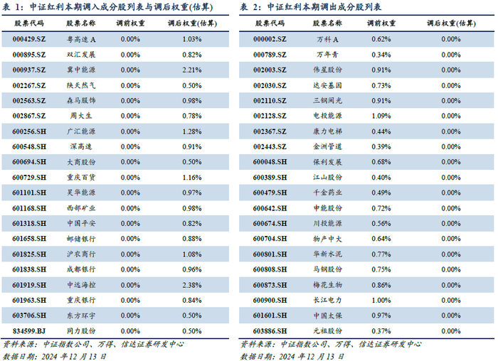 根据中证红利指数编制规则,中证红利成分股每年调整一次,样本调整实施时间为每年12月的第二个星期五的下一交易日,即今年的12月16日。中证指数公司当前已公布新的成分股名单,但尚未公布成分股的具体权重,预计将于本月末公布。我们根据指数编制规则中的权重计算方式对新的成分股权重进行估算,权重计算方式为:中证红利指数采用股息率加权,且单个样本权重不超过10%,总市值在100亿元以下的单个样本权重不超过0.5%。