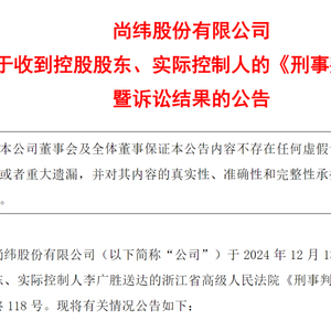 12月15日,尚纬股份公告,公司收到控股股东、实际控制人李广胜送达的浙江省高级人民法院《刑事判决书》。李广胜因操纵证券市场罪,被判处有期徒刑三年二个月,并处罚金七百万元。李广胜在二审期间退缴的违法所得100万元予以没收,上缴国库;不足部分继续追缴。该判决为终审判决。