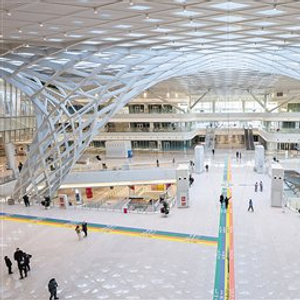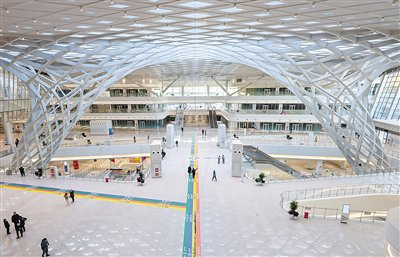 从北京朝阳站交通枢纽站厅放眼望去,生根于地下的两根菱形网格巨柱仿佛两片荷叶的枝干,从地下“生长”到空中,支撑起硕大的屋盖,光线透过一个个菱形网格的玻璃窗照射进来,为冬日增添了几分暖意。