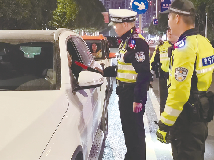 本报讯(记者周志英 实习生陆相颖 通讯员杨婧)红灯亮时,对排队车辆驾驶人快速进行检查;绿灯即将亮起时,果断撤离路口,不影响车辆正常通行……12月14日晚,南宁交警在市区开展流动式“快闪”行动,对酒驾醉驾等违法行为进行查处。
