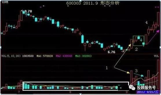 第四、股价回落必须要有10日线的支撑,股价止跌企稳,一般来说,量能会极度萎缩,走出的图形一般有单针探底、十字星、缩量小阳等。