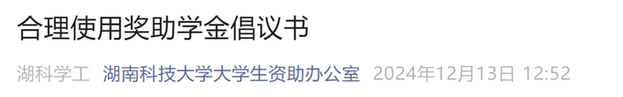 据“湖南科技大学大学生资助办公室”公众号,12月13日,该校学生资助管理中心发布《合理使用奖助学金倡议书》称,奖助学金不仅是对同学们学习成绩的肯定,更是部分贫困学生学习与生活的重要保障。它的获得历经层层筛选与评选,来之不易。因此,同学们应当倍加珍惜这一荣誉,合理规划资金的使用,确保能够切实有效地利用好这笔资金。优先用于学费、住宿费、教材费和必要的生活用品。合理使用奖助学金,自觉抵制奢侈消费,不使用奖助学金相互请客,不在经济上相互攀比。