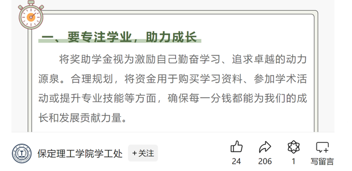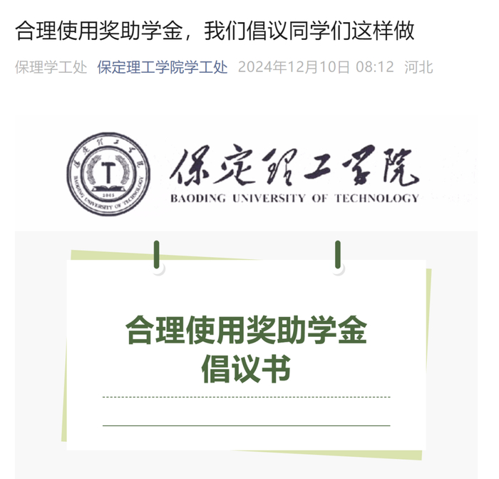 如何让手中的奖助学金在使用过程中充分体现其价值?“保定理工学院学工处”公众号发文倡议同学们做到“三要”“二忌”。