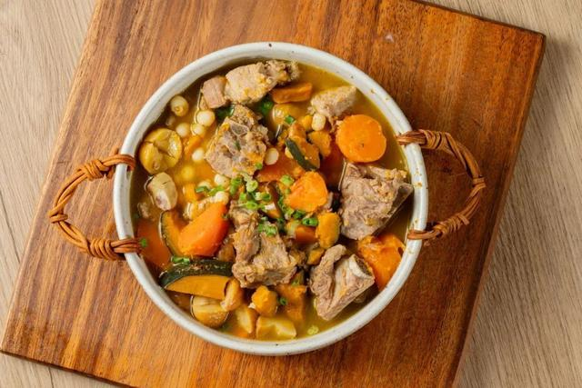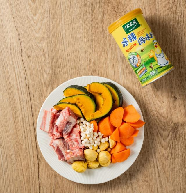 排骨300克、南瓜1个、板栗仁200克、芡实150克、姜片100克、鸡精调味料10克、食用盐4克