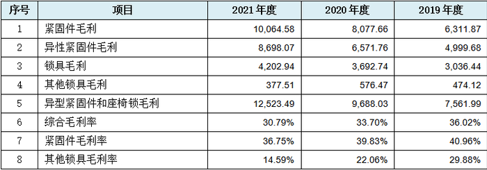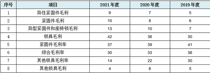 从上表可见,发行人核心的紧固件毛利首先出现数据规律性变化情况,接着仅剩的锁具毛利数据出现规律性变化,再接着是综合毛利率及核心的紧固件毛利率数据均出现数据规律性变化,发行人盈利类数据几乎全部涉及。
