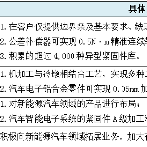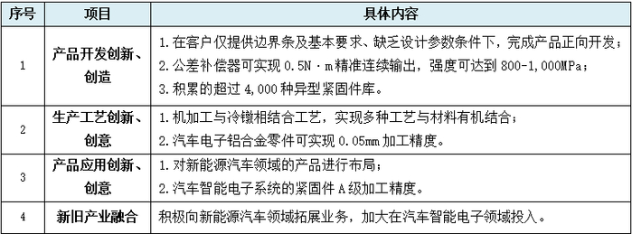 我们以上表中第一项发行人“产品开发创新、创造”具体情况为例,第一个“在客户仅提供边界条及基本要求、缺乏设计参数条件下,完成产品正向开发”,此应该是任何一家企业都具备的基本能力,而非发行人所谓产品开发的创新、创造。而第二个“公差补偿器可实现0.5N·m精准连续输出,强度可达到800-1,000MPa”,此表面所谓“公差补偿器”可能为一般意义上与螺丝配套使用的垫圈、垫片。如果的确如此,是否意味着该两个指标数值为发行人产品开发的创新、创造。如果第三个“积累的超过4,000种异型紧固件库”是发行人的产品开发创新、创造,是“积累”动作还是“4,000种”甚至“库”是发行人的创新、创造?或者三者结合就成了发行人产品开发的创新、创造。