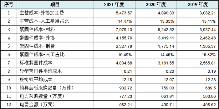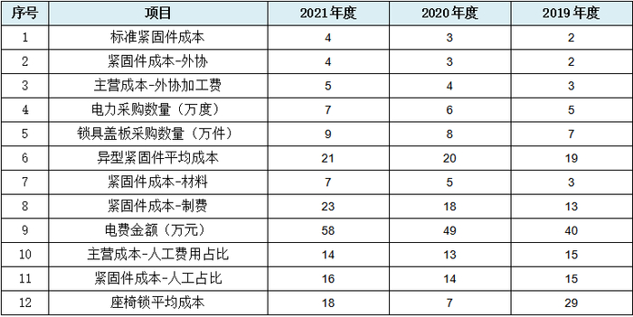 从上表可见,首先沦陷的是主营业务成本中的外协加工费和直接人工占比数据,其次是核心产品紧固件的大面积成本数据规律性变化,再其次是锁具相关的成本数据规律性变化,也即发行人成本类数据规律性变化所涉范围不是点而是面。