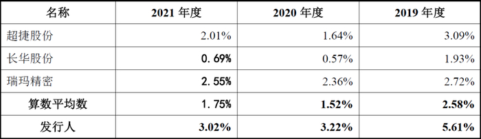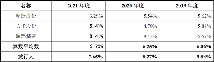 从上表可见,发行人的管理费用率依次为9.83%、8.27%、7.65%,明显高于行业平均值50%左右。从具体可比数据来看,发行人除了2020年度-2021年度低于瑞玛精密外,发行人的管理费用率可比也同样为最高。