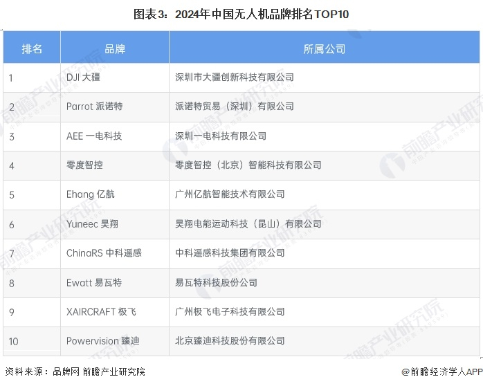 根据品牌网披露的信息,2024年中国无人机品牌排名TOP10分别是DJI大疆、Parrot派诺特、AEE一电科技、零度智控、Ehang亿航、Yuneec昊翔、ChinaRS中科遥感、Ewatt易瓦特、极飞与Powervision臻迪。