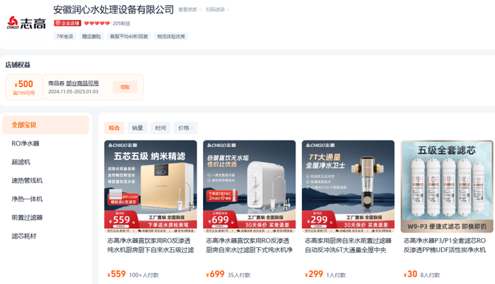 企查查显示,安徽润心水处理设备有限公司的注册资本为500万元,成立于2011年5月。其在淘宝的企业店铺售卖“志高”牌净水器,店铺页面宣称“品牌直营”。《消费者报道》记者咨询该店铺客服,对方表示无法出示与志高的授权证书,但保证是正品。