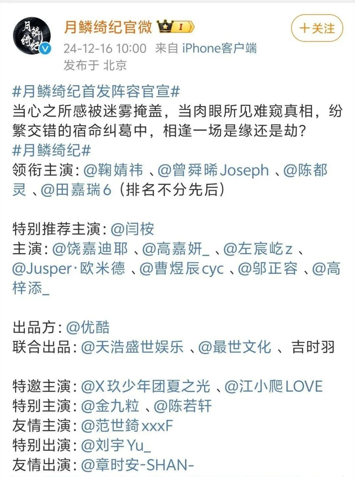 12月16日上午10时,《月鳞绮纪》官方发布了首款概念海报,同时公布了主要演员阵容。领衔主演包括鞠婧祎、曾舜晞、陈都灵和田嘉瑞(排名不分先后)。此外,还有多位实力派演员加盟,如闫桉、饶嘉迪耶、高嘉妍等,甚至还有金靖,怀孕生子后首次复出!该剧由优酷出品,天浩盛世娱乐、最世文化和吉时羽联合制作。