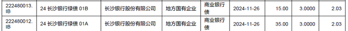 11月28日,长沙银行在全国银行间债券市场成功发行50亿元绿色金融债券,票面利率为2.03%,此次绿色金融债发行吸引了来自国有大行、城商行、农商行、基金公司、证券公司及理财子公司等多层级投资机构的积极认购。申购机构近130家,全场认购倍数近6倍。