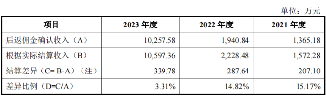 在对第一轮问询的回复中,美亚科技表示,发行人确认的后返佣金收入比实际结算金额偏小,结算差异金额和比例都较小,确认的后返佣金收入具有谨慎性,不存在较大的差异,亦不存在期后冲减后返佣金及跨期的情形。