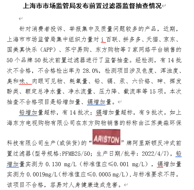 2023年6月,上海市市场监督管理局发布的前置过滤器监督抽查情况显示,1款标称由江苏美淼环保科技有限公司生产(或供货)的阿里斯顿反冲式前置过滤器被抽检不合格,铅增加量实测为0.13 mg/L,超出质量安全标准近130倍。