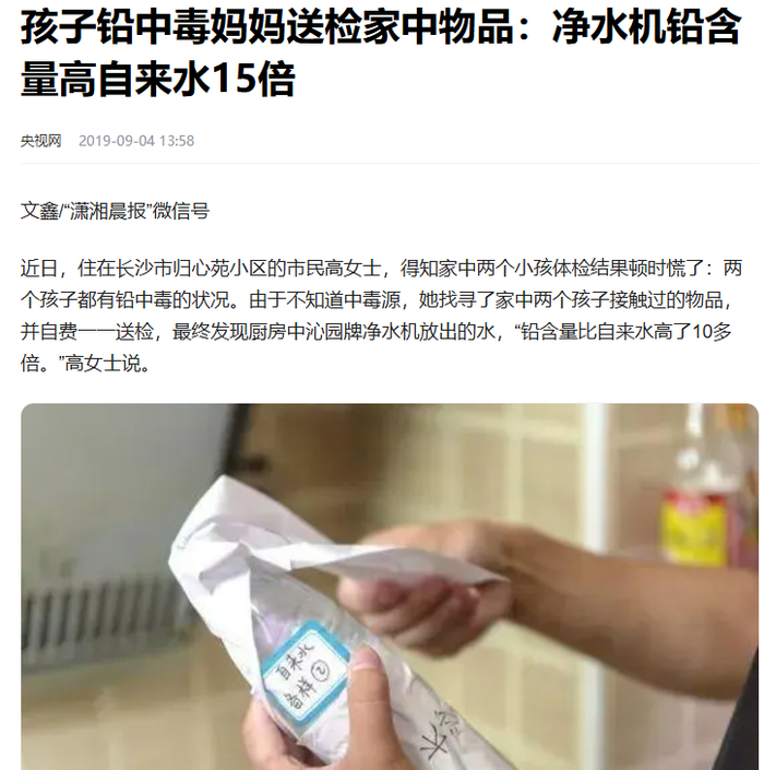 早在2019年,《潇湘晨报》就曾报道,长沙的高女士家中两个孩子体检有铅中毒状况,她送检家中物品,发现净水机出来的水铅含量比自来水高15倍