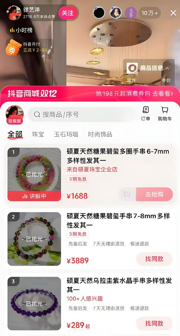 12月10日晚,黄子韬和徐艺洋在直播间,卖起了水晶手链,价格从几百元到上千元,最贵的一款售价3889元的水晶手链,一上架就被抢光了。