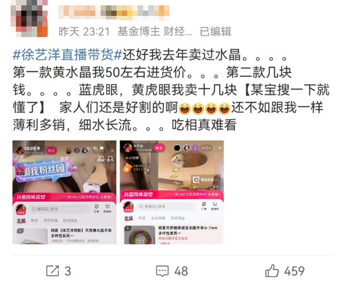 有微博大V直接开怼,质疑他们夫妻卖“天价水晶”,就是在割韭菜,diss他们吃相难看。