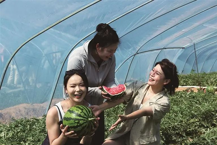 近年来,丰宁积极培育麒麟西瓜地理标志产品,努力打造精品西瓜品牌,提升农业种植效益,促进农民增收,助力乡村振兴。图为游客在丰宁五道营乡“丰品”麒麟瓜种植基地采摘西瓜。承德日报记者 李国强 通讯员 辛荣军 摄