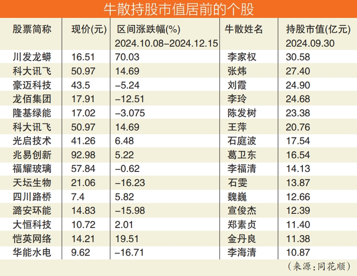 数据显示,十大超级牛散在2024年三季度末合计持有144家A股公司,持股市值合计达到612.38亿元。具体而言,陈发树和葛卫东家族是持股市值超100亿元的超级牛散。