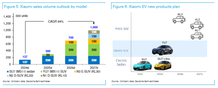 新产品和细分市场方面,小米此前表示,计划在2025年中期推出“YU7”纯电动SUV。报告预计,到2027年,该款SUV年销量将达到40万辆。