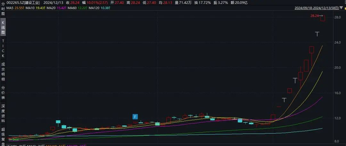 数据显示,进入12月后,建设工业股价飙升。截至12月13日收盘,10个交易日录得9个涨停板,涨幅达147.94%。