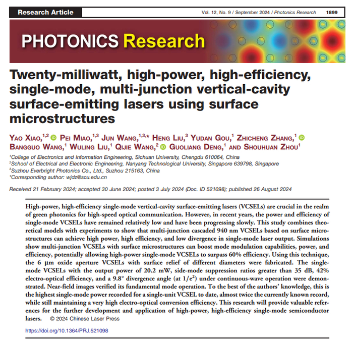 针对以上问题,四川大学电子信息学院及苏州长光华芯光电技术股份有限公司王俊教授研究团队提出了一种基于多结VCSEL扩展纵向增益以提升单模VCSEL功率的方法,并构建了多结VCSEL的模式分析模型,解决了单模功率难以突破10 mW左右水平的难题,在直流驱动下实现了20.2 mW的单基横模激光输出,功率转换效率达42%,发散角为9.8° (1/e2)和5.1° (FWHM)。这是迄今为止单颗VCSEL的最高单模功率,其功率值接近现有单模功率记录的两倍。这项研究将为高功率、高效率单模半导体激光器的进一步开发和应用提供创新方案,并对“绿色”高速光通信的发展具有重要的推动作用。相关研究成果以“Twenty-milliwatt, high-power, high-efficiency, single-mode, multi-junction vertical-cavity surface-emitting lasers using surface microstructures”为题,发表于Photonics Research 2024年第9期。