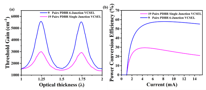 图2 19对p-DBR单结和9对p-DBR 6结VCSEL,(a) 表面Si3N4光学厚度与阈值增益的关系;(b) 多结VCSEL功率转换效率扩展特性