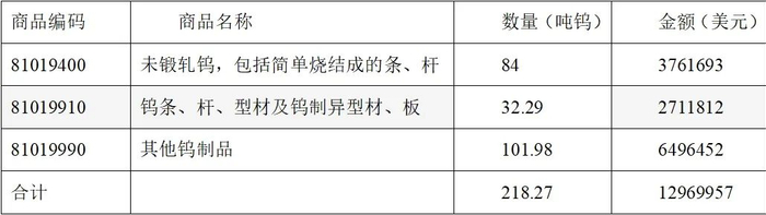 2024年1-10月三种钨品出口美国数量及金额