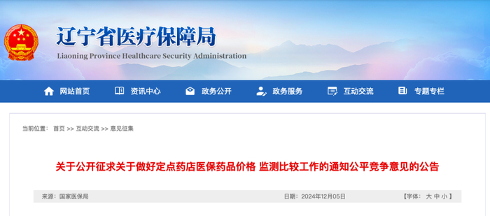 近日,辽宁省医保局发布《关于做好定点药店医保药品价格监测比较工作的通知》(下称“通知”),并向社会公开征求意见。