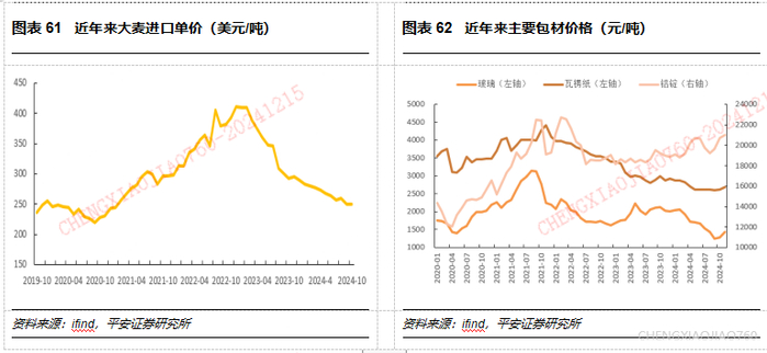 大麦价格开始下行,包材价格持续缓解。23年以来啤酒成本端总体价格较22年有所下降,2022年12月大麦进口单价到达阶段性高点410.42美元/吨,23年1月出现拐点,下滑至409.73美元/吨,2023年8月商务部终止对澳大利亚进口大麦征收反倾销税和反补贴税,政策松绑进一步推动啤酒产业的成本下行,大麦价格在2024年10月下滑至249.96美元/吨。啤酒包材方面(浮法玻璃、瓦楞纸、铝锭等)价格较22年缓解较多,价格高点集中在21年Q4,后续随着上游供需缺口缩小,包材价格均进入下行期,2024年11月浮法玻璃/瓦楞纸/铝锭价格分别为1429.70/2689.90/21003.75元/吨。