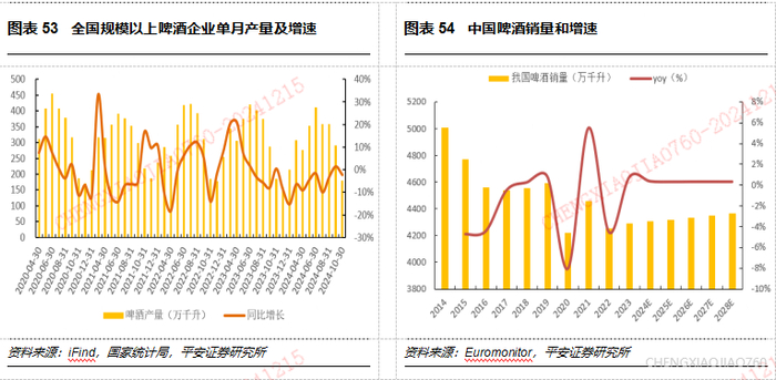啤酒产量有所下滑,旺季持续低迷。从2023年7月开始,啤酒产量开始同比增速转负。今年旺季期间,受到天气的影响,部分地区雨水较多,广东、福建、浙江等地受到持续降雨和台风等影响,导致啤酒销量下滑,2024年7/8月产量分别同比下滑10%/3.3%。此外消费者信心的变化和消费场景的复苏乏力导致啤酒产量持续低迷,2024年10月全国啤酒产量为180.7万千升,同比下降2.3%。