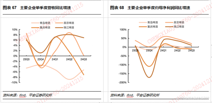 企业之间产生分化,燕京啤酒和珠江啤酒Q3表现较好。2024Q3青岛啤酒/燕京啤酒/重庆啤酒/珠江啤酒营收同比变动-5.28%/+0.19%/-7.11%/+6.89%,其中青岛啤酒和重庆啤酒单季度营收有所下滑;归母净利润同比变动-9.03%/+19.84%/-10.10%/+10.60%,其中燕京啤酒净利润增速较高主要是受益于U8等中高档产品延续快速增长态势,带动公司产品结构优化;而珠江啤酒纯生大单品保持较快增长,量价齐升,带动归母净利润较快增长。