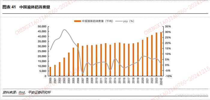 乳制品需求疲软,政策加码有望拉动消费。当前C端消费整体疲软,乳制品的需求也同样受到压制。根据美国农业部的数据,2023年中国液体奶消费量达到4.37千万吨,同比增长5.90%;预计2024年消费量将达4.42千万吨,同比增长1.10%,增速明显放缓。2024年9月农业农村部等七部门联合印发《关于促进肉牛奶牛生产稳定发展的通知》,提出促进牛肉牛奶消费,鼓励有条件的地方通过发放消费券等方式拉动牛奶消费,期待后续需求端边际改善。