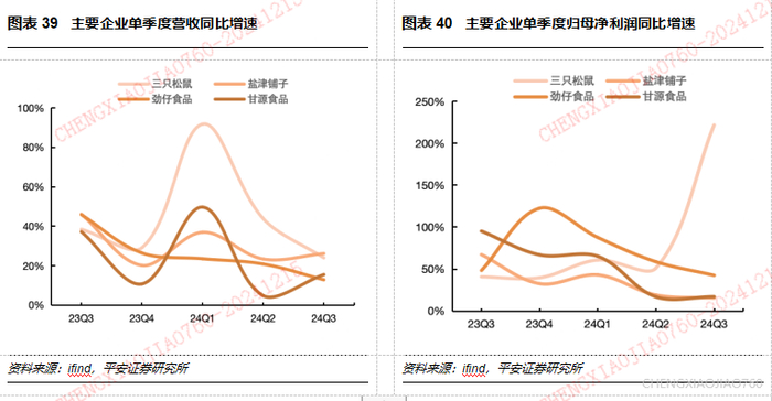 品类品牌是制造型企业的内生增长动力。24Q3三只松鼠/盐津铺子/劲仔食品/甘源食品营收同比增长24.03%/26.20%/12.94%/15.58%;归母净利润同比增长221.89%/15.62%/42.58%/17.10%。其中三只松鼠的业绩表现尤为亮眼,公司坚定贯彻“高端性价比”总战略,业务上“D+N”全渠道打法更加成熟,聚焦分销日销品打造并完成首轮铺市,终端动销积极,同时打造极致供应链,利润率进一步抬升。盐津铺子连续推出“大魔王”、“蛋皇”两个品类品牌,确定品类品牌引领、打造大单品的战略,通过产品研发、“向上游多走一步”打造差异化竞争策略,品类品牌的打造为公司贡献高质量业绩增长。