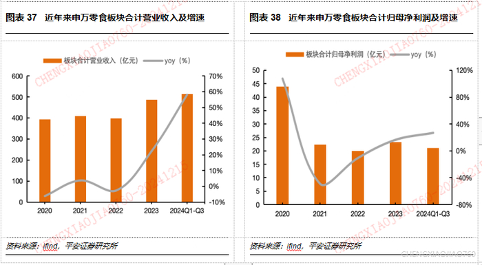 板块业绩增长强劲,势能不减。2024Q1-Q3申万零食板块年实现营收514.34亿元,同比增长58.03%;实现归母净利润21.16亿元,同比增长26.88%,为食品饮料行业业绩增速最快的子版块之一,新渠道和新产品红利共同推动行业繁荣。后续我们认为渠道红利虽行程过半但势能仍存,叠加新品类红利具备长逻辑,能够继续演绎板块成长性。