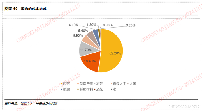 啤酒生产成本中包材占比较大,通过提价传导。从成本构成看,啤酒成本结构中占比最大的为包材成本,占52.2%;其次为制造费用18.4%;再者为原料麦芽,占11.7%,原材料及包材价格有较大影响,且常通过提价传导。