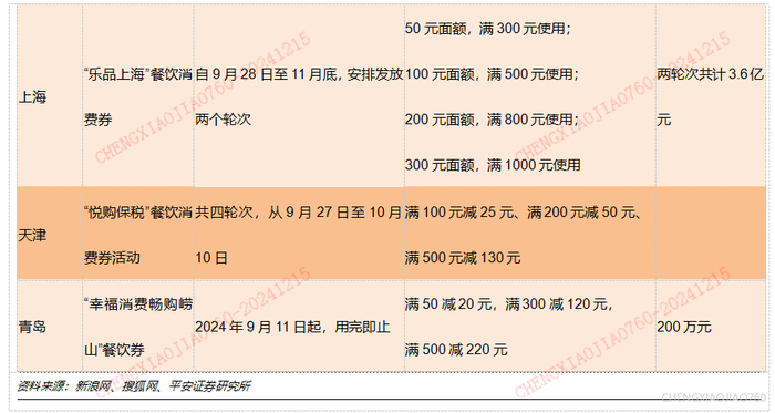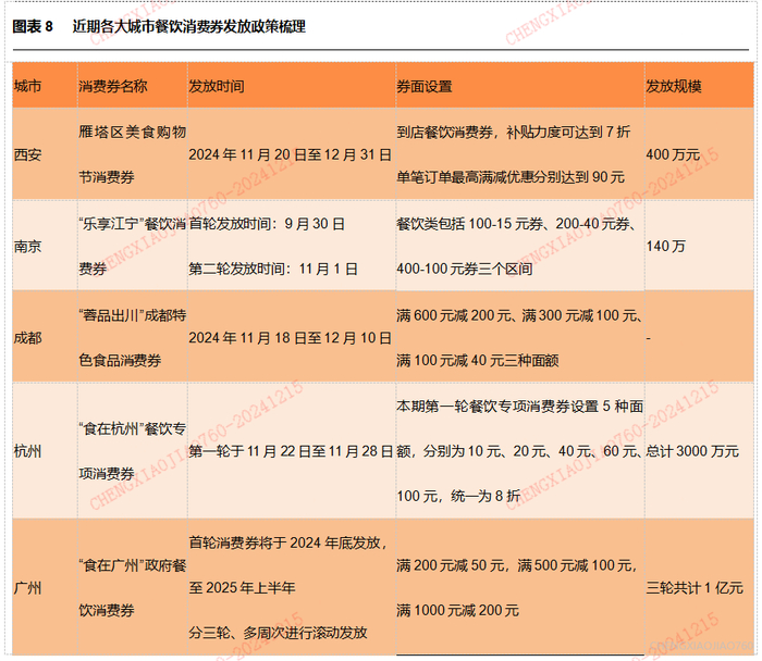 政策助力需求复苏,有望带动上下游回暖。餐饮消费在2024年3-4月急转直下跌入冰点,之后开始缓慢修复。2024年9月起,各大城市陆续推出餐饮消费券,如“乐品上海”将两轮次共计发放3.6亿元餐饮专项消费券,旨在拉动居民餐饮消费。根据国家统计局数据,2024年10月社零餐饮收入为4952.10亿元,环比增长12.11%,同比增长3.19%,刺激餐饮消费政策成效初显。我们认为后续拉动内需仍是政策释放的重要方向,应当关注餐饮产业链作为顺周期行业的投资机会。