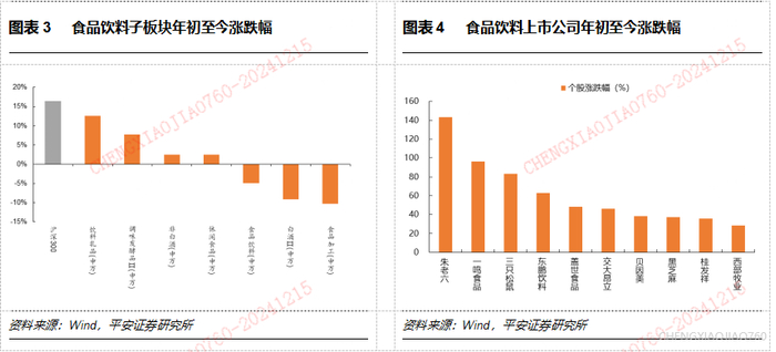 各子行业间产生分化,饮料乳品及调味品表现较好。年初以来(截止12月10日),各子行业涨跌幅表现产生分化。其中SW饮料乳品板块上涨12.5%、SW调味发酵品板块上涨7.7%、SW非白酒板块上涨2.5%,SW休闲食品板块上涨2.4%,而SW白酒板块及SW食品加工板块录得负增长,分别下跌9.2%和10.3%。食品饮料个股中,朱老六(+143.03%)、一鸣食品(+96.21%)、三只松鼠(+82.92%)、东鹏饮料(+62.72%)、盖世食品(+48.12%)涨幅排名前列。