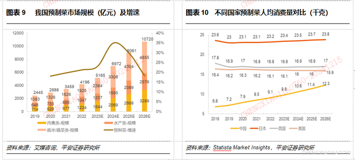 行业发展万亿级空间,人均消费量亟待提升。根据艾媒咨询数据,2022年中国预制菜市场规模为4196亿元,同比增长21.31%,预计未来中国预制菜市场将保持较高的增长速度,2026年预制菜市场规模将达10720亿。从人均消费量角度,2022年我国人均预制菜消费量仅为9.1KG,远低于预制菜产业成熟的国家的人均消费量,同年美、英、日的人均预制菜消费量分别为16.1KG、16.8KG、23.2KG;但我国人均消费量提升速度较快,提升空间大。