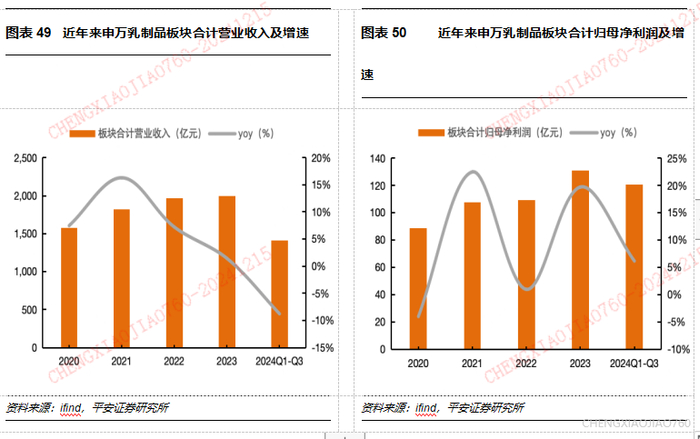 板块营收降幅较大,净利润维持稳定。申万乳制品板块2024Q1-Q3年实现营收1407.04亿元,同比下降8.77%;实现归母净利润120.72亿元,同比增长6.17%。板块营收降幅较大,主要原因是去年同期基数较高且当前居民收入预期下降导致市场需求较为疲软,导致终端动销压力较大,但Q3已环比Q2有所改善。板块净利润方面,能够延续增长态势,并且单季度间已有环比改善。