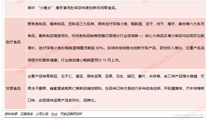 制造型企业新品红利不断释放,成为行业后续核心动能。对于制造型零食公司,增长来源不仅来自于新兴渠道,也同时来自于新产品的拓展。目前可以看到,三只松鼠实施“高端性价比”战略,线下分销推出105款日销品,价格体系主要集中于1-9.9元;盐津铺子推出“蛋皇”和“大魔王”等品牌;洽洽不断推出焦糖、山核桃、茶衣瓜子等口味;劲仔食品推出“七个博士”溏心鹌鹑蛋等新品举措,能够不断抢占消费者心智,提升公司核心竞争力。