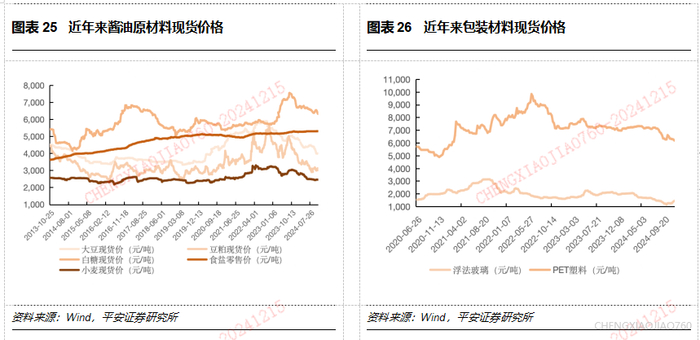 原材料价格回落,利润弹性有望兑现。同样以酱油为例,其主要原材料大豆的价格由2022年约5500元/吨的高位,到2024年11月回落至约4008元/吨,价格有所回落且趋于稳定,其他原材料也呈现同样趋势。而主要包材方面,浮法玻璃价格由2021年9月3130元/吨的高位,至今降至约1458元/吨;PET塑料也同样由2022年6月9680元/吨高位下滑至6196元/吨的相对低位。整体而言调味品原材料价格有所回落且趋于稳定,使得调味品厂商利润弹性逐步兑现。