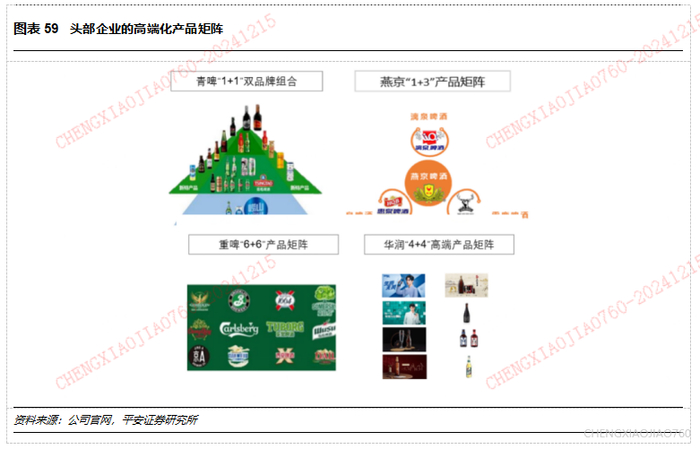 头部企业纷纷搭建高端核心矩阵,抢占高地。重庆啤酒组成“6+6”品牌矩阵并淘汰“山城”品牌;青岛啤酒坚定实行“1+1”品牌策略,并推出百年之旅、一世传奇、琥珀拉格等高端产品拉升啤酒单品天花板;燕京啤酒采取“1+3”品牌发展战略,以“燕京啤酒”为主品牌,同时培育三个地方性优势品牌。