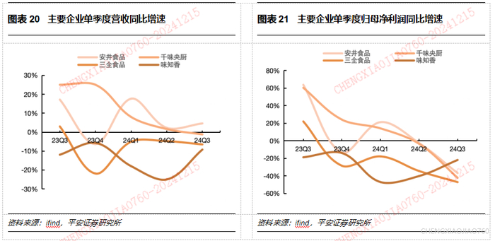 小B>大B>C端,主要企业业绩表现分化。24Q3仅安井食品的营收实现正增长,同比增长4.63%;千味央厨/三全食品/味知香营收同比下降1.17%/6.46%/9.19%。可以看出渠道修复顺序上,小B>大B>C端。安井食品小B占比更高,营收同比正增长;千味央厨小B占比较高,营收下滑较小;三全食品、味知香C端占比更高,受速冻食品终端消费疲软和预制菜C端需求下降影响,营收同比下滑更多。归母净利润方面,24Q3头部企业均有所下滑,安井食品/千味央厨/三全食品/味知香归母净利润同比下降36.76%/42.08%/47.02%/21.81%。