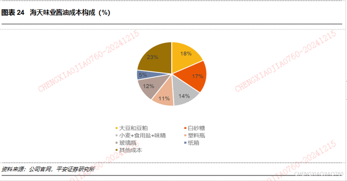 原材料依存度高,价格影响较大。对于调味品而言,其直接材料约占总成本的80%,因此原材料价格是对成本影响最大的因素。以海天味业的酱油为例,其中大豆和豆粕占总成本的18%,白砂糖占总成本的17%,小麦、食用盐、味精共占14%,塑料包装、玻璃包装两类包材成本分别约占总成本的11%和12%,而制造费用、人工费用、运输费用总共仅占总成本的23%。整体而言,调味品厂商对原材料依存度较高,原材料价格波动会对调味品厂商产生较大影响。