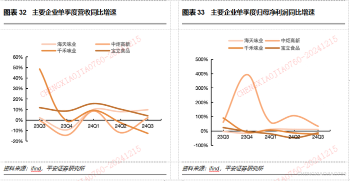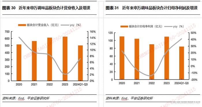 需求逐渐恢复,板块业绩稳步增长。申万调味品板块2024Q1-Q3实现营收502.52亿元,同比增长7.19%;实现归母净利润84.49亿元,同比增长40.95%,受益于餐饮需求持续复苏、成本回落、渗透率提高、产品更新迭代、集中度提升、头部企业持续深化改革红利释放以及经销商渠道库存恢复良性等因素,板块正持续恢复。