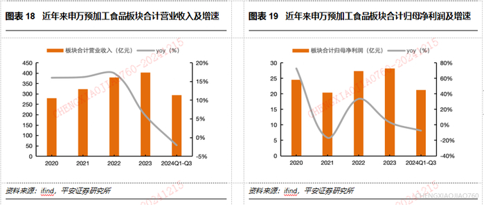 下游餐饮行业景气度低迷,板块业绩增速放缓。申万预加工食品板块2024Q1-Q3年实现营收294.45亿元,同比下降2.04%;实现归母净利润21.32亿元,同比下降7.47%。增速放缓主要受餐饮行业疲软和去年同期高基数的影响。当前下游餐饮需求保持弱复苏状态,景气度有所改善,期待未来在相关政策的刺激下餐饮产业链全面回暖。