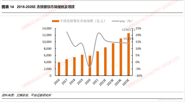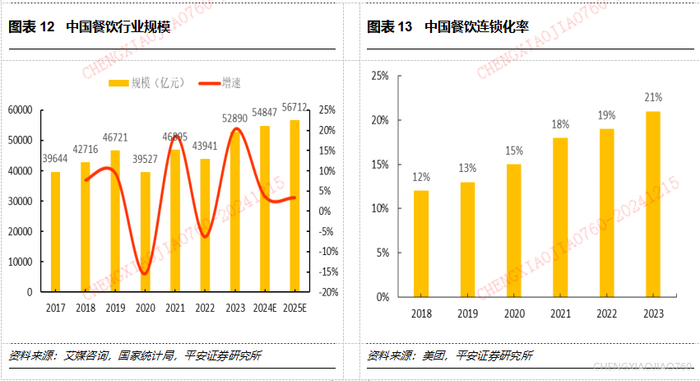 连锁化进程加快,预计连锁餐饮市场规模持续提升。据国家统计局,我国餐饮业市场规模由2017年的3.96万亿元提升至2023年的5.29万亿元,CAGR为4.9%,根据艾媒咨询预测,我国2024年餐饮市场规模将达到5.48万亿元,2025年将达到5.67万亿元,呈现持续增长态势。据美团数据,我国餐饮市场连锁化率为由2018年12%提升至2023年21%,始终保持增长态势,且对比美国54%的餐饮连锁化率,还有较大增长空间。根据艾媒咨询,我国2025年连锁餐饮市场规模将达到1.26万亿元,同比增长14.11%,持续为预制食品的发展提供沃土。