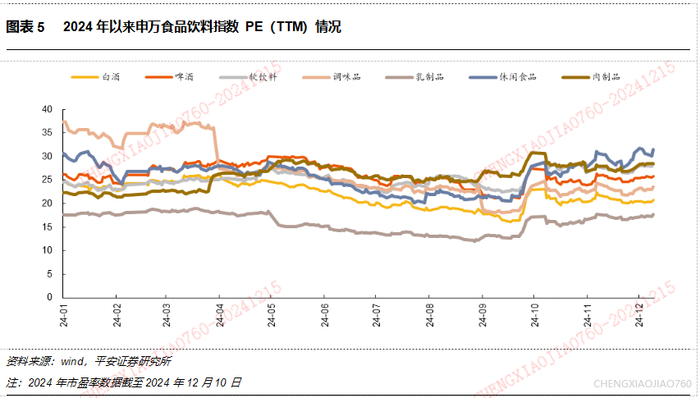食品饮料估值历经回调后已具备性价比。食品饮料行业作为必选消费品,需求偏刚性、抗风险能力较强,且具备持续增长的能力。在经历3年多的回调后,截至2024年12月10日,食品饮料板块(申万)PE(TTM)为22X,在31个行业中排名21位,已经具备估值性价比。分板块看,截至12月10日,白酒/啤酒/软饮料/调味品/乳制品/休闲食品/肉制品的PE(TTM)分别为20.8/25.8/28.5/23.6/17.7/31.5/28.5X,较年初分别同比-4/-0/+4/-14/-0/+1/+6X,除软饮料、休闲食品和肉制品外,子板块估值均出现明显回调。